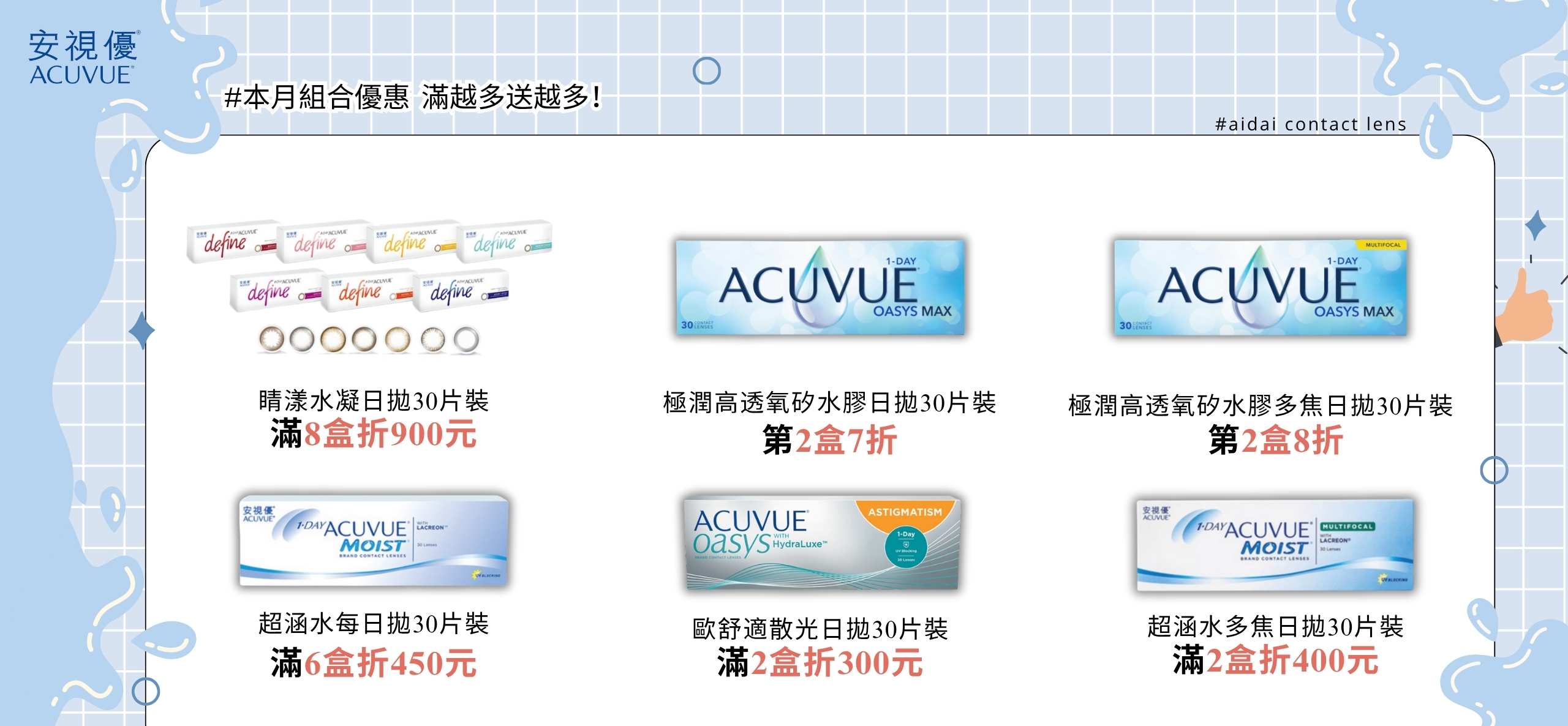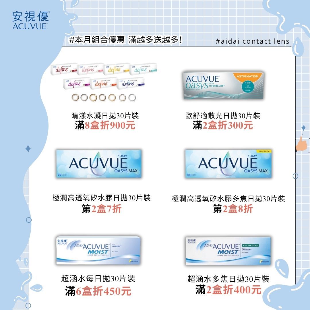 嬌生安視優、愛爾康、酷柏、博士倫等國際大廠隱形眼鏡品牌,提供高品質的隱形眼鏡產品。