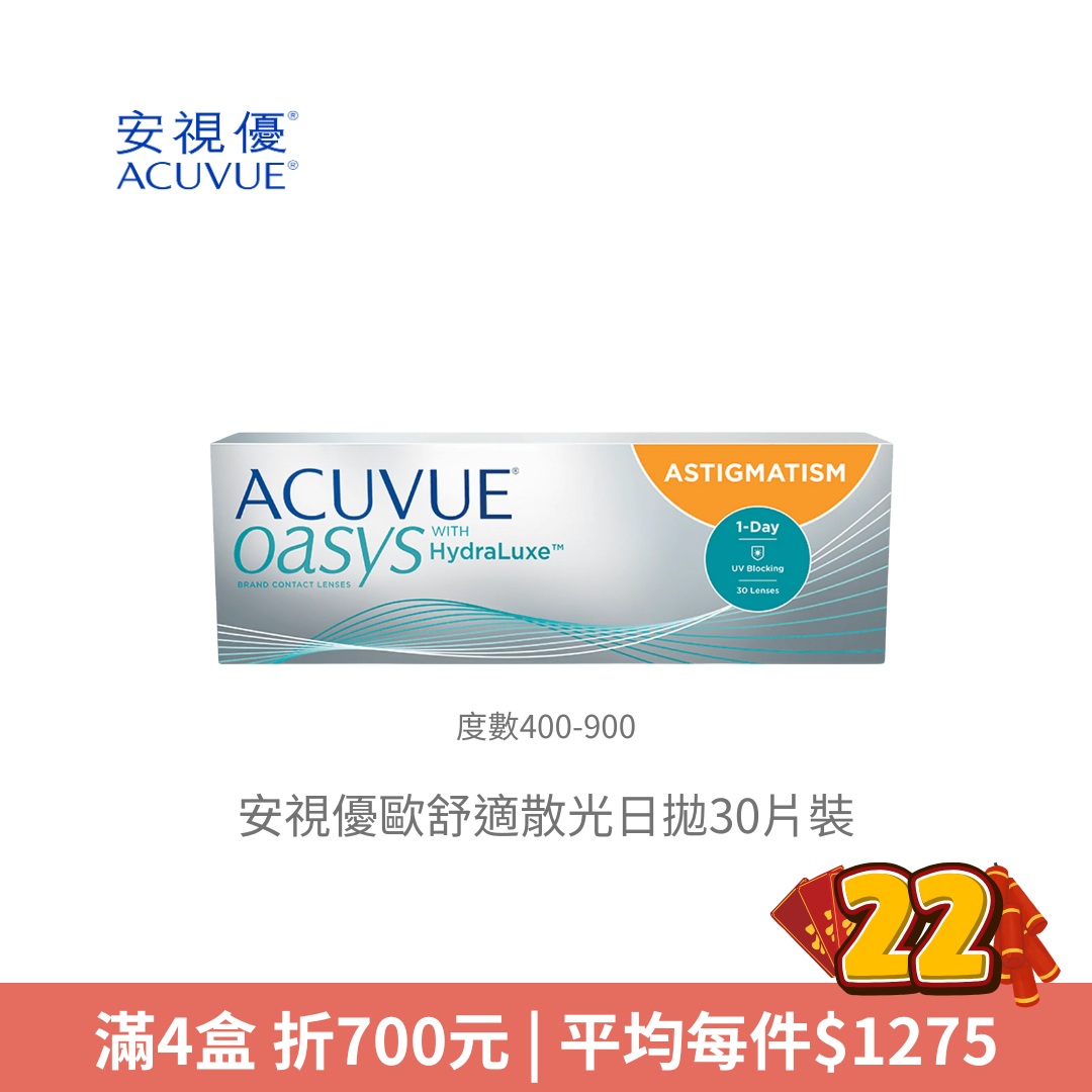嬌生安視優ACUVUE安視優歐舒適散光日拋30片裝(度數0~375)NT$ 1,500NT$ 1,450 -