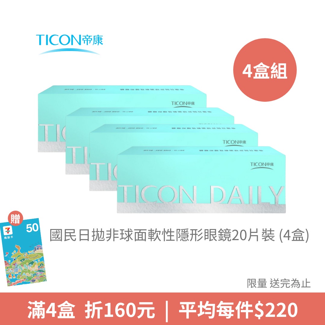 帝康Ticon國民日拋非球面軟性隱形眼鏡20片裝 (4盒組) ★另加贈50商品卡 (1月加碼活動) 限量_送完為止NT$ 1,040NT$ 880 -
