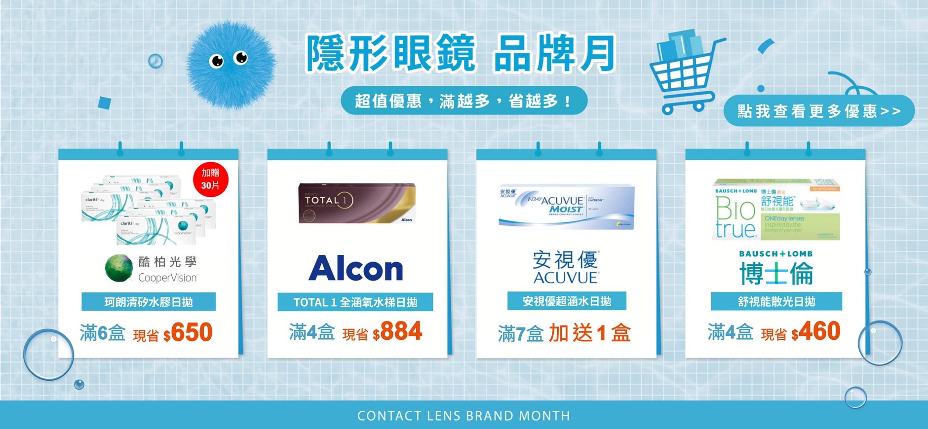 嬌生安視優、愛爾康、酷柏、博士倫等國際大廠隱形眼鏡品牌,提供高品質的隱形眼鏡產品。
